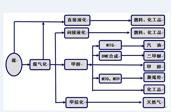 現(xiàn)代新型煤制油化工技術是以煤炭為基本原料,經(jīng)過氣化、合成、液化、熱解等煤炭利用的技術途徑,生產(chǎn)潔凈能源和大宗化工產(chǎn)品,如合成氣、天然氣、柴油、汽油、航空煤油、液化石油氣、聚乙烯、聚丙烯、甲醇、二甲醚等。改變傳統(tǒng)的煤炭燃燒、電石、煉焦等以高污染、低效率為特點的傳統(tǒng)利用方式。