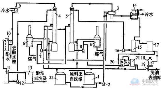 注:(1—原料槽;2—原料泵;3—原料與工業(yè)萘換熱器;4—初餾塔;5—精餾塔;6—管式爐;7—初餾塔熱油循環(huán)泵;8—精餾塔熱油循環(huán)泵;9酚油冷凝冷卻器;10—油水分離器;11—酚油回流槽;12—酚油回流泵;13—酚油槽;14—工業(yè)萘汽化冷凝冷卻器;15—工業(yè)萘回流槽;16—工業(yè)萘回流泵;17—工業(yè)萘貯槽;18—轉(zhuǎn)鼓結(jié)晶機(jī);19—工業(yè)萘裝袋自動(dòng)稱量裝置;20—洗油冷卻器;21—洗油計(jì)量槽;22—中間槽)